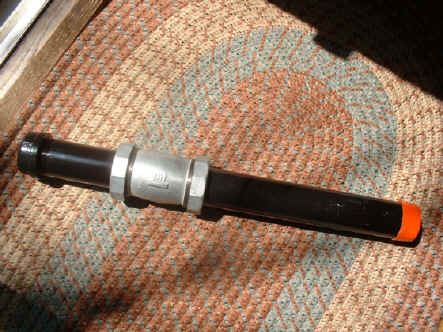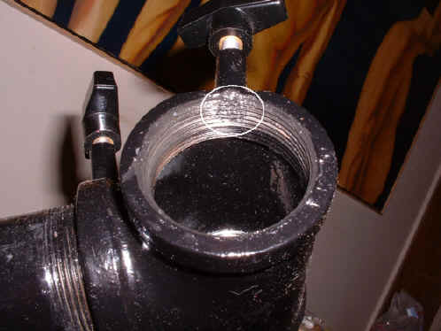 I began by filling the capped pipe with molten lead (also very toxic!) until I reached a weight comparable to, but just under, the weight of the OTA. As you can see in the photo, I also added a 2" compression fitting as an adjustable counterweight, allowing for varying sizes of eyepieces. This was necessitated by the fact that I use both 1.25" and 2" optics in my scope. The fitting was a bit pricey, but I just couldn't pass this up, and here's why...