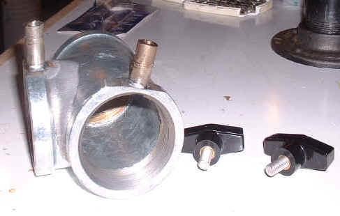 The process begins by grinding two "flats" on the "T" fitting, one for each bearing. Drill a rather large hole, I think these were 5/16", and tap to accept the proper size bolt. It is important that these holes are drilled as close to the ends of the fitting as possible. You want to apply pressure to four or five threads. After cutting the heads off the bolts and trimming the threads down so they won't protrude into the fitting, I drilled holes lengthwise through the bolts and tapped them to accept a 1/4 thread, hence making a longer shaft for the brakes. When this was complete, I screwed these shafts into the holes I drilled (and tapped) into the T-fitting and soldered them in place with silver solder. Note: don't use stainless steel for the shafts, it is difficult to drill and impossible to tap. Besides, you're going to paint all this anyway, right? Finally, I purchased a couple handles at my local hardware store and fitted them with 1/4-20 threaded rod, pictured above. Snag yourself a couple nylon bushings, small enough to slide easily into the shafts and of the proper length, and grease them up with whatever you are lubricating your bearings with. With your R.A. and declination bearings in place, slide the bushings into the shafts and thread your handles in after. Make sure your bushings are long enough that they won't bind but short enough that the handles will thread in four or five turns. Note: when tapping the shafts, I only tapped about halfway down. You don't want your bushings sliding up and down against threads, it would wear them quickly I would think.