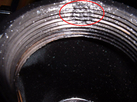 ...and here is a magnification of the same break surface. Notice how the nylon bushing "squished" into the entire recessed area immediately under the end of the fabricated shaft. The resulting threads in the nylon mesh nicely with the T-fitting threads.