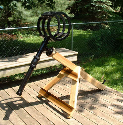 I won't go into great detail about the construction of this mount. However, the same mount can be found in Making and Enjoying Telescopes by Robert Miller & Kenneth Wilson. This particular support was designed by Dr. Allan Saaf, a contributor to this book. Notice, I used poplar for the OTA end rings (as seen in the bottom photo) and poplar for the mount to match.
