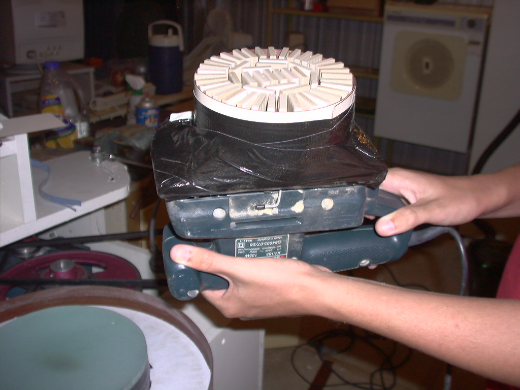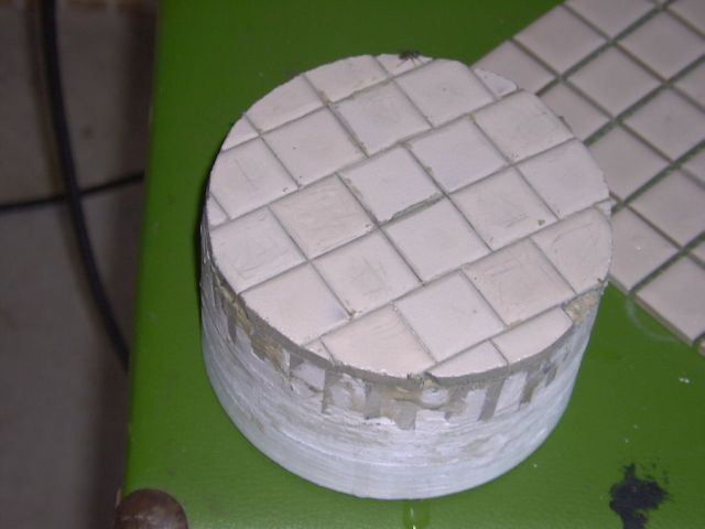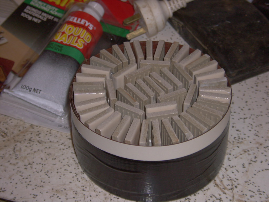 While waiting for the bases of my new tools to be turned up, I decided to try a little experiment with the 5" and 6.4" tile on edge tools. Since both of them had great trouble spinning correctly, I decided to epoxy tiles in the conventional horizontal pattern to these 2 tools. The 5" had tiles araldited to them with no channels in it. The 6.4" had the tiles left attached to the backing net and I used liquid nails (epoxy?) to glue them down. The results and pictures are below. Any comments will be appreciated.