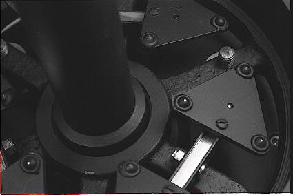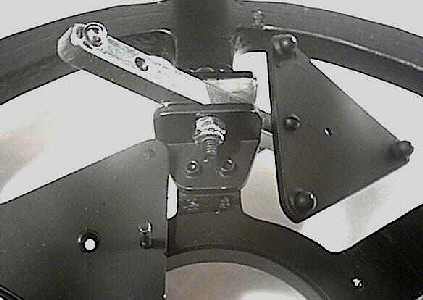Long small screws (size 4-40) are threaded through the triangular plates near their edges above the pivot bars. These pass very loosely through over-sized holes in the pivot bars to keep the plates from rotating. The screw threads are then smoothed off with a file and the screws are bent slightly to keep them from catching on the edges of their respective holes in the pivot bars.