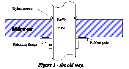Perhaps you too have been plagued by the shortcomings of this common method which is depicted by the cross-sectional representation in figure 1, and employs a baffle tube whose outer diameter is only slightly smaller than the diameter of the perforation in the primary mirror. This tube is then clamped directly to the primary mirror by means of three nylon screws spaced equally around the circumference of the tube whose heads bear directly against the optical surface of the mirror.