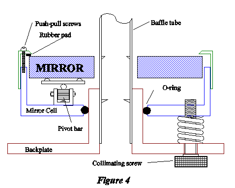 The mirror cell is held centered in the telescope tube by a thick rubber O-ring set into the inner bore of the cell, which allows the cell to slide along the protruding cylindrical portion of the backplate with sufficient travel for back-focus adjustment by the collimating screws. The optical axis of the primary mirror can then be aligned independently of the permanently aligned mechanical axis of the baffle tube, which makes optical collimation much easier. The cross-sectional view in figure 4 illustrates the final assembly.