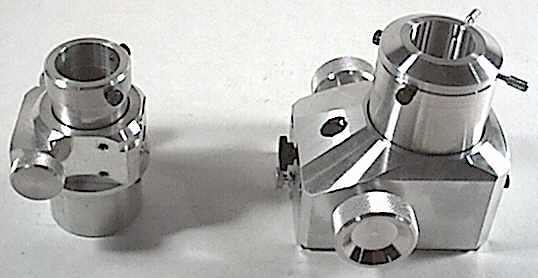 Any sort of mounting method can be used with this focuser. It can be mounted directly to a flat surface, or adapted to a curved tube wall, or be bored to accept a refractor's draw tube. For one of my 1-1/4 inch models I tapped threaded holes in the bottom of the body to mount a 2-inch flanged barrel. This allows me to use the focuser as a 1-1/4 inch eyepiece adapter in any other 2-inch focuser (like my old helical job), and only adds about 1-1/2 inches of height.